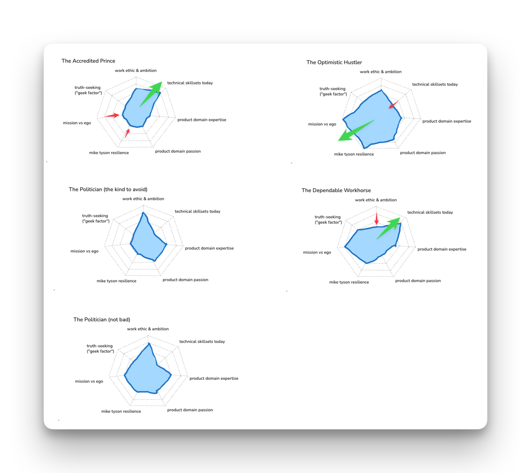 One valuable thing i've gained being an early stage founder for ~4 years is — through experiences both joyful and traumatic, and always high stakes — developing a better understanding of the different early stage startup teammate/cofounder/employee archetypes.