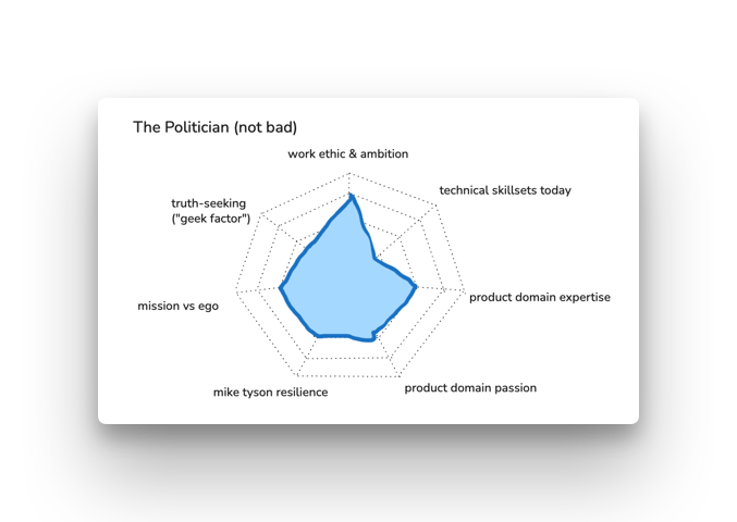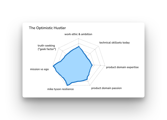 On paper: typically has low technical skillsets but high EQ to the table and relentless optimism. Think Jack Ma
