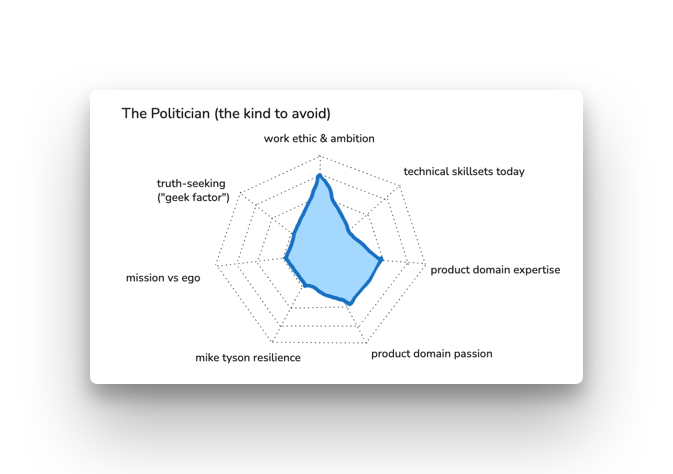 On paper: typically has technical experience at brand-recognizable companies. Usually an engineer