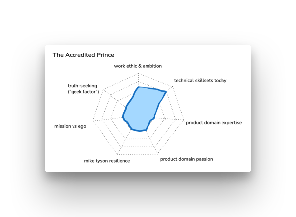 Weaknesses: often, pedigreed folks who've only worked at large companies have never truly experienced career failure or pain. (what does truly experiencing career feailure or pain mean? hint: if you don't immediately wince when you think of a personal career failure — think Steve Jobs getting ousted at Apple — hate to break it to you, but you've never experienced this). the way this manifests is that they focus in the early days on ego-influenced topics, like: